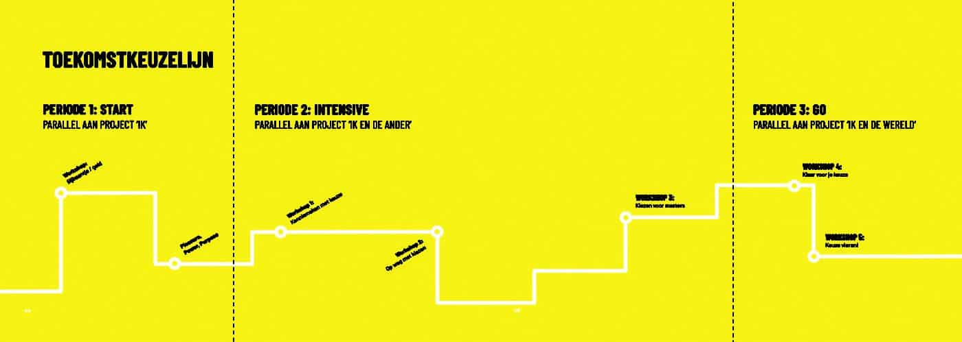 Tijdens je tussenjaar, bij zowel het halfjaar- als het jaarprogramma, zijn er verschillende momenten waarop je op een constructieve manier aan de slag gaat met je toekomst. Dat doen we aan de hand van de toekomstkeuzelijn. Binnen de toekomstkeuzelijn vinden verschillende workshops en gesprekken plaats, die jouw helpen om een goede keuze te maken voor je toekomst.